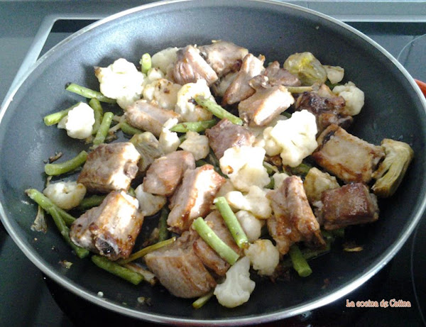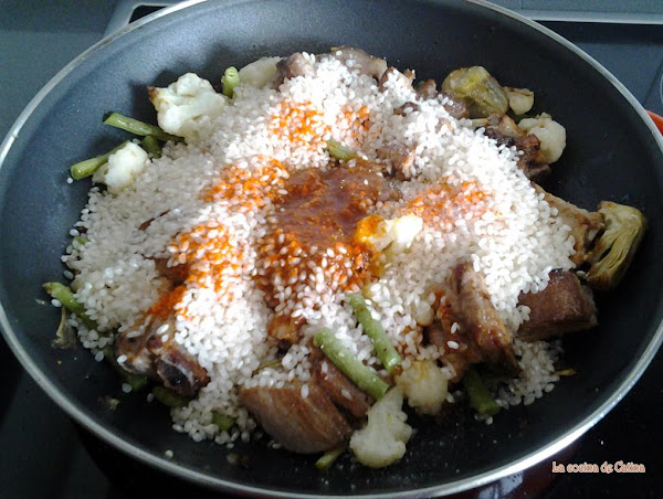 En el mismo aceite se echan los ajos machacados, la cebolla, las alcachofas, las ramitas de coliflor y las judías verdes. Cuando empieza a dorarse añadimos el tomate y freímos durante 7 u 8 minutos, incorporamos las costillejas que teníamos reservadas y el arroz y lo sofreímos todo durante unos minutos.