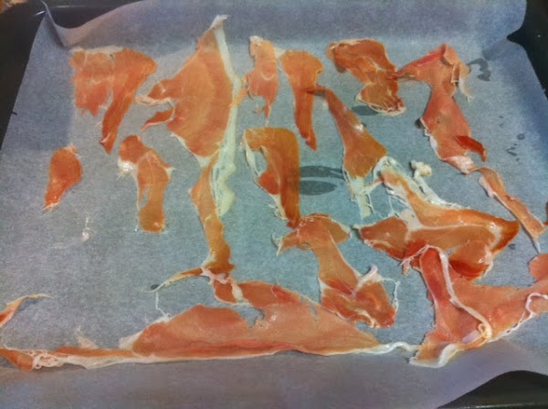 Además para decorar (y para comer, que está buenísimo) hice unos trozos de jamón al horno. De esta manera, además se desgrasa mucho el jamón y queda muy crujiente!