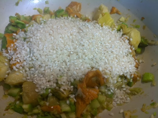 Echamos el arroz y removemos con cuidado durante otro par de minutos y echamos el vino blanco.