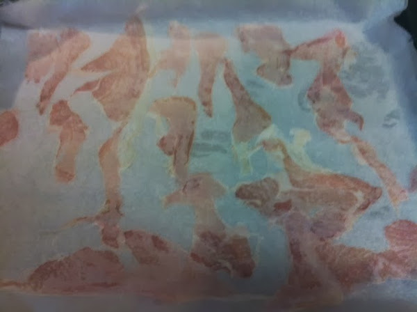 Mientras cuece el arroz y con el horno precalentado a 200º, poner en una bandeja de horno papel vegetal y sobre él unos trozos de jamón serrano finito, sobre el jamón otra hoja de papel vegetal, presionamos y colocamos una fuente de horno encima para que haga presión y metemos 5 minutos al horno.