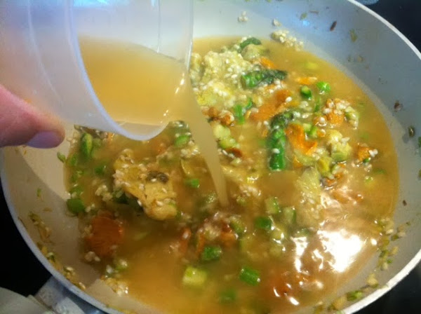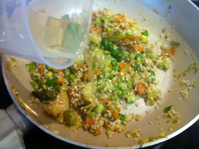 Subimos el fuego para que evapore rápidamente el vino y cuando prácticamente esté todo evaporado, echamos el caldo y ponemos a cocer.