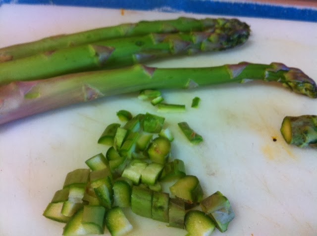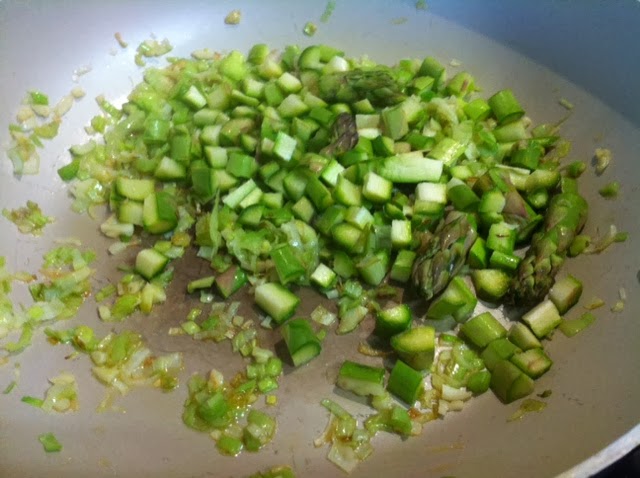 Mientras se pocha, cojer los espárragos, cortándoles la parte dura del tallo, y troceándolos. Si son muy gordos, cortarlos por la mitad primero y luego trocear.