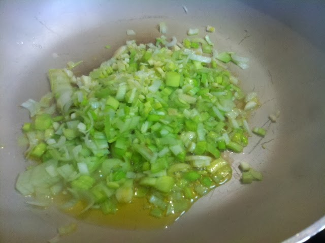 Comenzamos limpiando el puerro y picándolo en brunoise (cuadraditos) y poniéndolo a pochar en una cazuela baja con 1 cucharada de aceite de oliva a fuego medio.