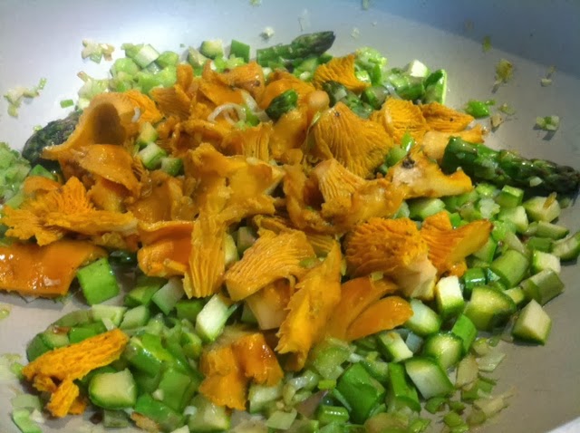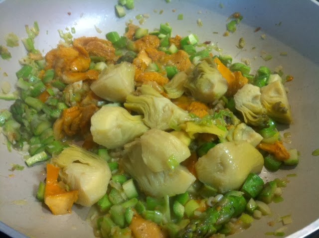 He utilizado espárragos trigueros, alcachofas en conserva y rebozuelos. Podéis utilizar las setas u hongos que más os gusten.