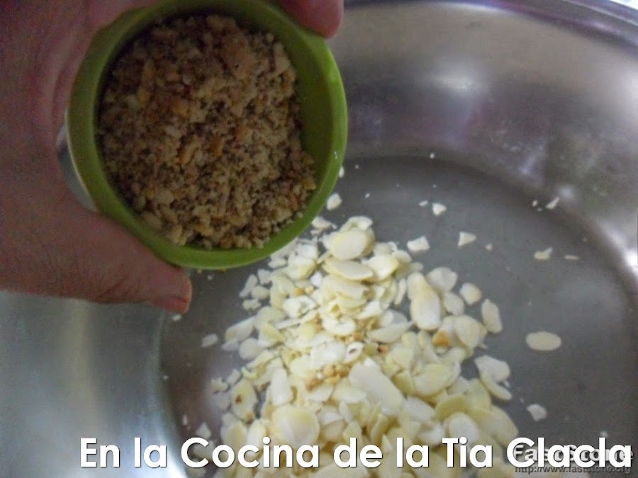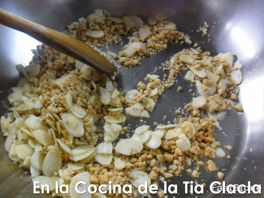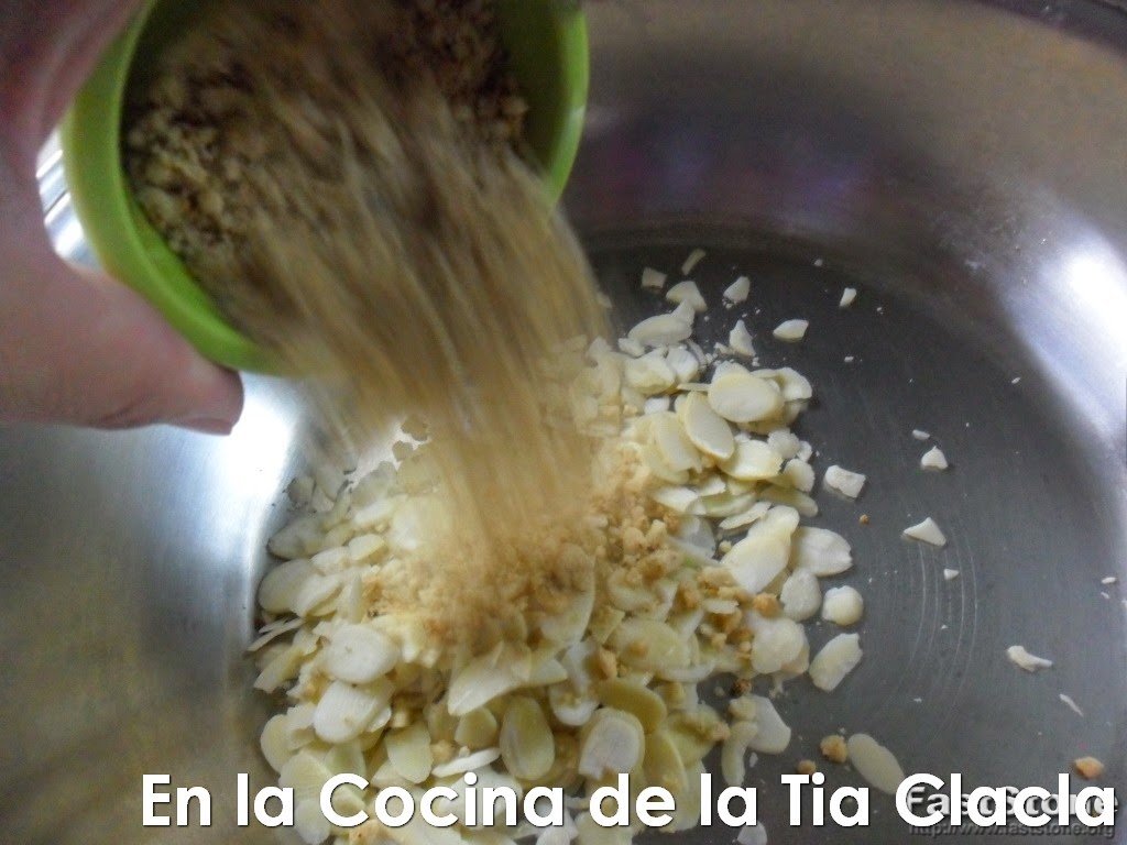 · Ponga otra sartén al fuego y cuando este caliente, agregue las almendras y/o el maní molido y tueste un poco.