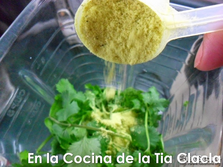 · Póngalos dentro de la licuadora con 1 taza de agua y la cucharada o los cubos de consomé de pollo, (puede substituirlo por consomé de vegetales, o una cucharada de sal y pimienta).