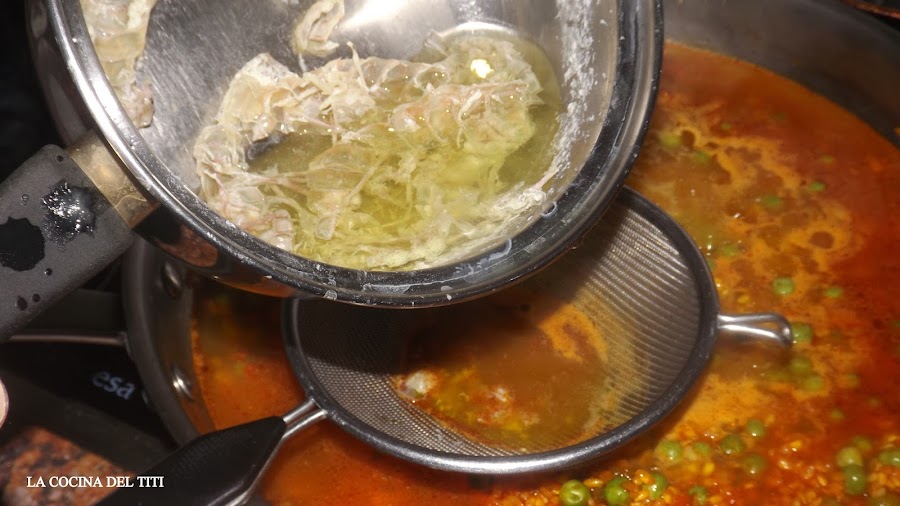 4º Agregamos el colorante y echamos el caldo obtenido de sus cascaras en el que cubrimos sobrepasando como un dedo por encima ya despues va si nos gusta mas caldoso o mas seco. Salpimentamos y dejamos reducir a temperatura suave.
