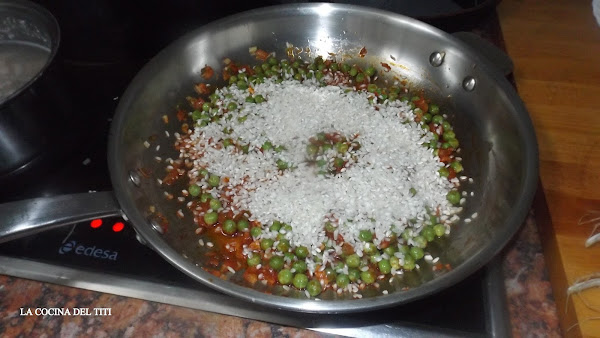 3º Echamos los guisantes y el arroz y dejaremos que sude con todo el fondo y moviendo de vez en cuando hasta que veamos que el arroz tome color.
