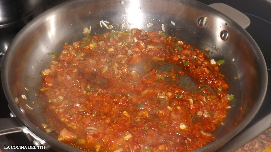 2º Preparamos el fondo con las verduras donde pochamos en aceite de oliva la cebolla, ajos y pimientos y posteriormente la carne de pimiento y el tomate dejando rehogar hasta que el tomate se haga.