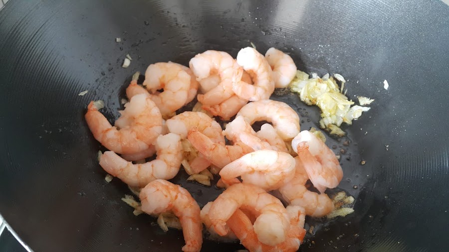 Cuando la cebolla esté blanda y casi transparente añadimos las gambas.