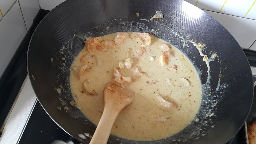 Le damos un par de vueltas, añadimos la nata (crema de leche) junto con la leche de coco y lo dejamos unos minutos a fuego bajo.