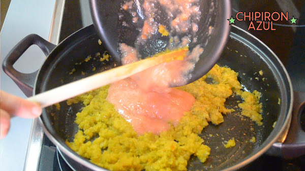 Incorpora el tomate triturado al sofrito y echa un poco de sal.