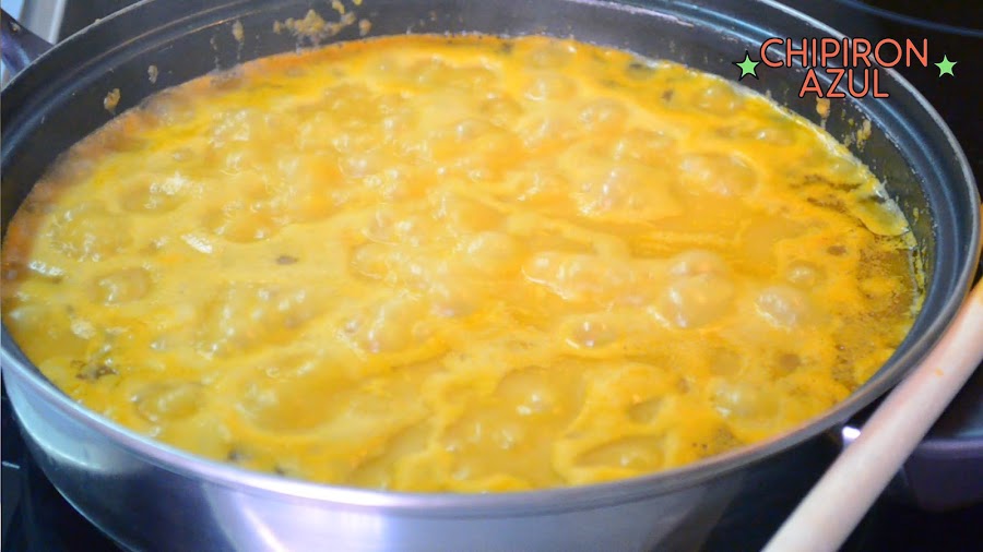 Añade el caldo de pescado y marisco, mejor si está caliente.