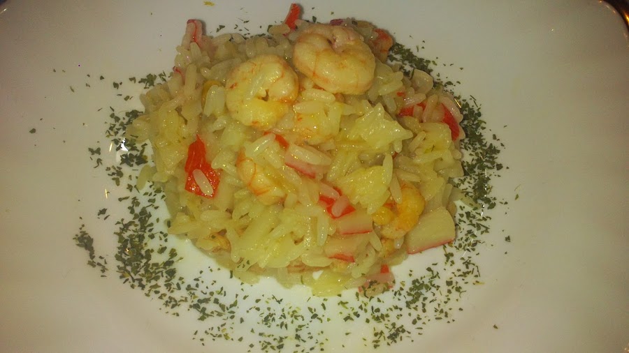 Esta receta es muy sencilla a la par de rica. En primer lugar picamos bien el ajo y lo echamos en una pota con una cucharada de aceite. Cuando empiece a estar el aceite caliente incorporamos las gambas y las dejamos cocinar hasta que se doren. A continuación añadimos la taza de arroz, lo removemos durante un minuto y le echamos 3 tazas de agua (usamos la misma taza del arroz). Salamos al gusto y dejamos cocer. Cuando reduzca casi toda el agua incorporamos los palitos de cangrejo troceados y removemos mezclando bien todo. Emplatamos y a ZAMPAR!!!!