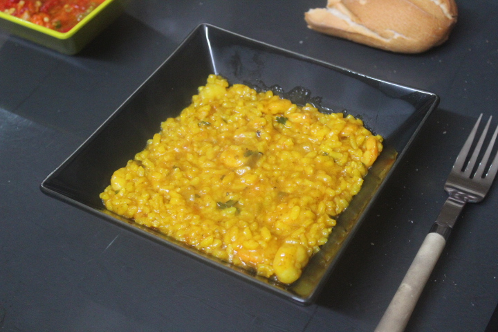 Partimos de un sofrito que teníamos guardado en el congelador, dos puñaditos de arroz y unas gambas peladas congeladas.