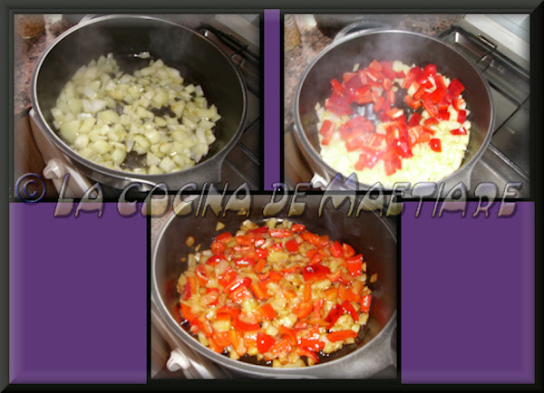 Mientras troceamos cebolla y pimiento en trozos medianos. Poner a calentar aceite en una sartén antiadherente y poner la cebolla a sofreír. Cuando lleve 1 minuto añadir el pimiento y saltear el conjunto a fuego medio hasta que la cebolla comience a dorar y el pimiento esté tierno. Añadir el ajo picado y cocinar otro minuto.