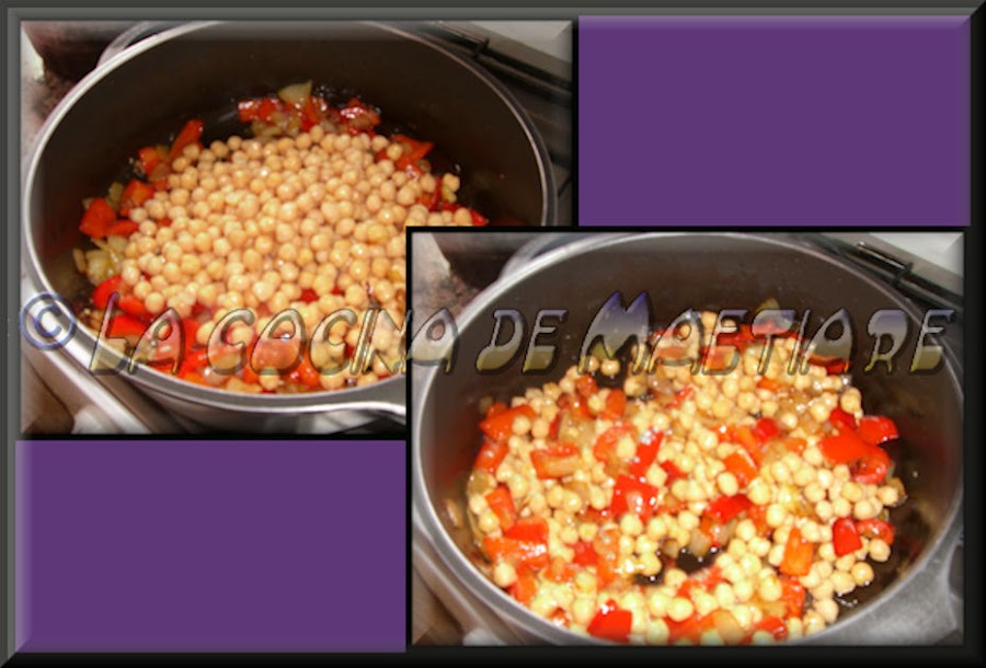 En un bol colocamos en el fondo el arroz y echaremos por encima los garbanzos con su salsa.