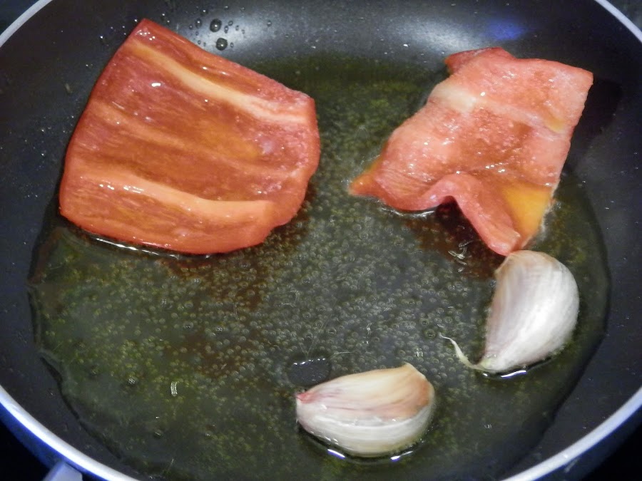 En una sartén,ponemos aceite a calentar y cuando ya está caliente,añadimos los ajos y el pimiento.
