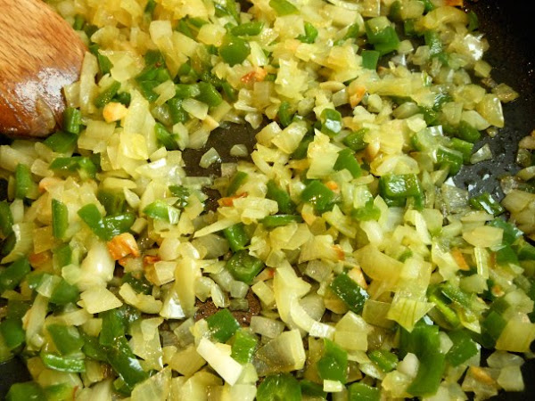 Cuando los dientes de ajo estén dorados, baja el fuego al nº 4 de la placa vitrocerámica y añade la cebolla y el pimiento verde troceado junto a una poquita de sal fina.
