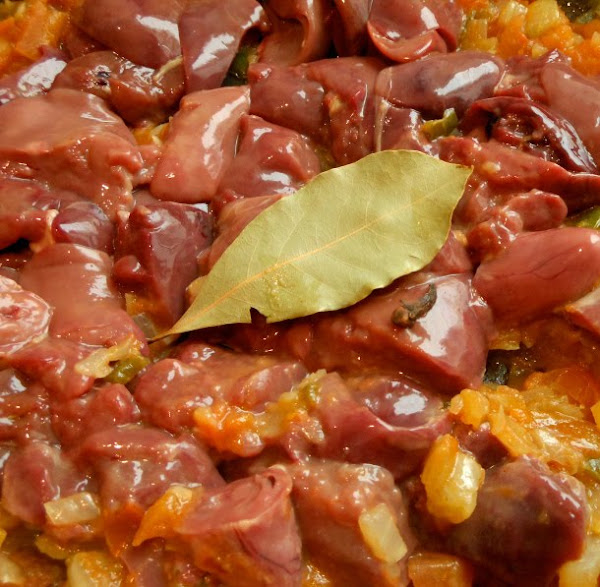 Seguidamente, añade los higaditos de pollo, los clavos de olor y la hoja de laurel; remueve durante 2-3 minutos con tu cuchara de madera hasta que los higaditos hayan cambiado de color.