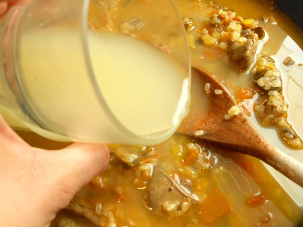 Caldo de pollo, el triple del volumen del arroz