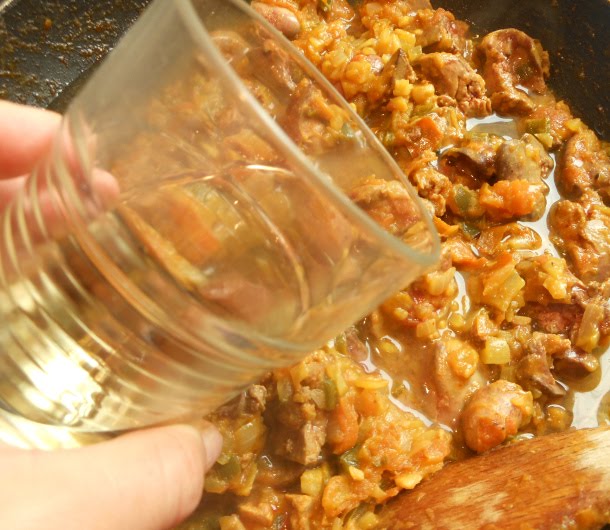 A continuación vierte el medio vaso de vino blanco seco y deja que el alcohol se evapore, removiendo de vez en cuando con tu cuchara de madera.