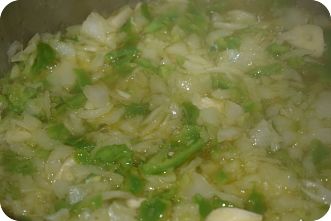 Pon aceite a calentar en el fondo de una cacerola. Pica una cebolla, un pimiento verde y los dientes de ajo. Sofríe.