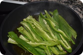 Mientras en una sartén fríe las tiras de pimientos. Reserva encima de papel absorvente.