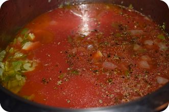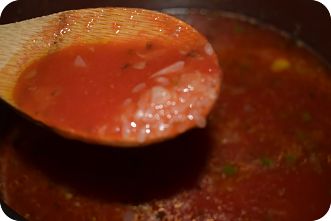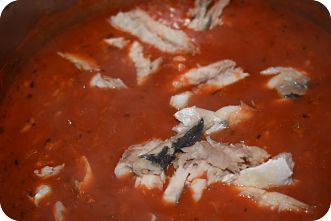 Añade el tomate triturado y una lata y media de agua ( la media puede ser del caldo de pescado que has reservado, para mi gusto, se potencia demasiado el sabor y lo pongo todo de agua. Pero eso es a vuestra elección ). Pon el azúcar , orégano y sal al gusto.