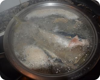 Lo primero que haremos será preparar el pescado quitando las cabezas y vísceras. Los clocamos en una cacerola, cubrimos de agua, ponemos un poco de sal, la hoja de laurel la cebolla partida por la mitad. Lo cocemos alrededor de 10 minutos ( si no son muy grandes , incluso en menos tiempo estarán listos ). Colamos el caldo, reserva y lo ponemos a escurrir.