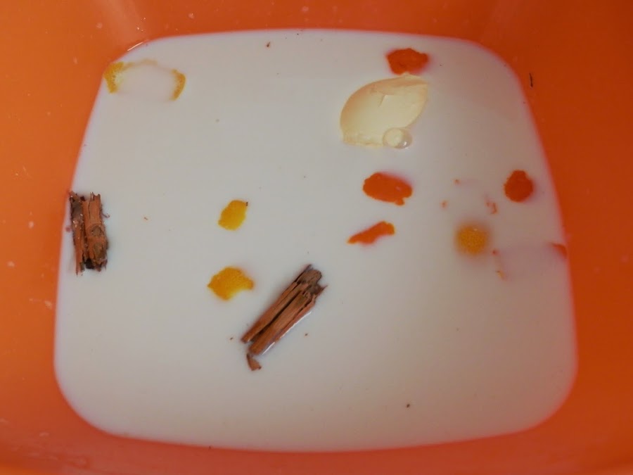 Añadimos al arroz: la leche, la mantequilla, el limón y la naranja, la canela en rama y el azúcar.