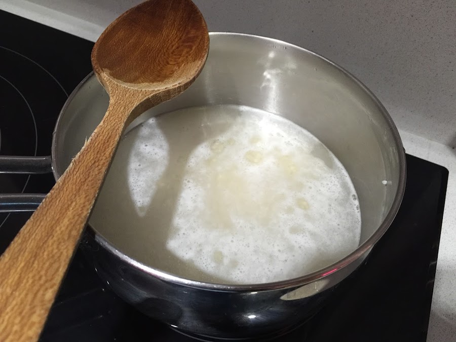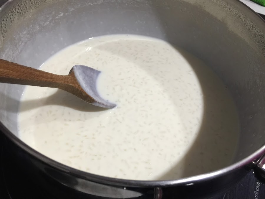 4. Cuando el arroz haya absorbido toda el agua lo pondremos junto con la leche infusionada. Removeremos para integrarlo y lo dejaremos 30 minutos a fuego medio-bajo, 3-4 sobre 9. A partir de los 30 minutos la leche empezará a coger consistencia y es a partir de este momento que no debemos dejar de remover durante 40 minutos más. Empezará a tomará la textura ideal a partir del minuto 60, aunque dependiendo del arroz puede necesitar algo más, en mi caso lo tuve en total 70 minutos.