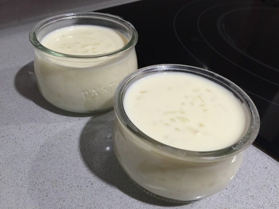 6. Vertemos el arroz con leche en los recipientes, con estas cantidades os saldrán 6 raciones pequeñas o 4 grandes. Cubrimos la superficie con film y llevamos a la nevera hasta el día siguiente.