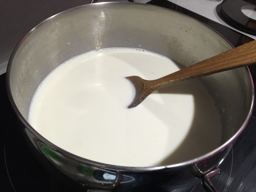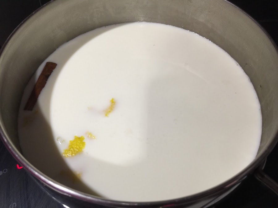 1. Ponemos en una olla la leche a fuego bajo, no hagáis caso al nueve de la fotografía, lo bajé enseguida. Ponemos en ella la piel de un limón y la rama de canela partida por la mitad. Lo dejamos hervir a fuego muy bajo durante 15 minutos y paramos el fuego.