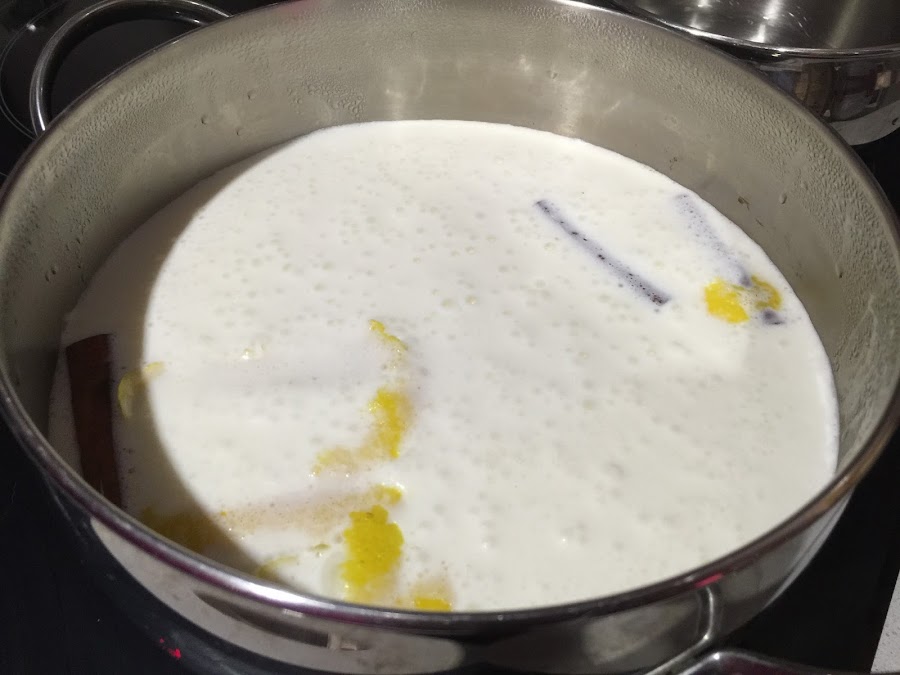3. Mientras el arroz está absorviendo el agua colamos la leche infusionada, retiramos la canela y la piel del limón. Vertemos la leche en una olla limpia grande.