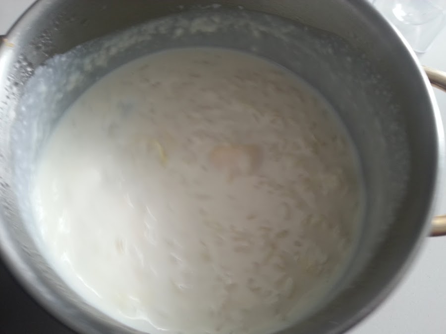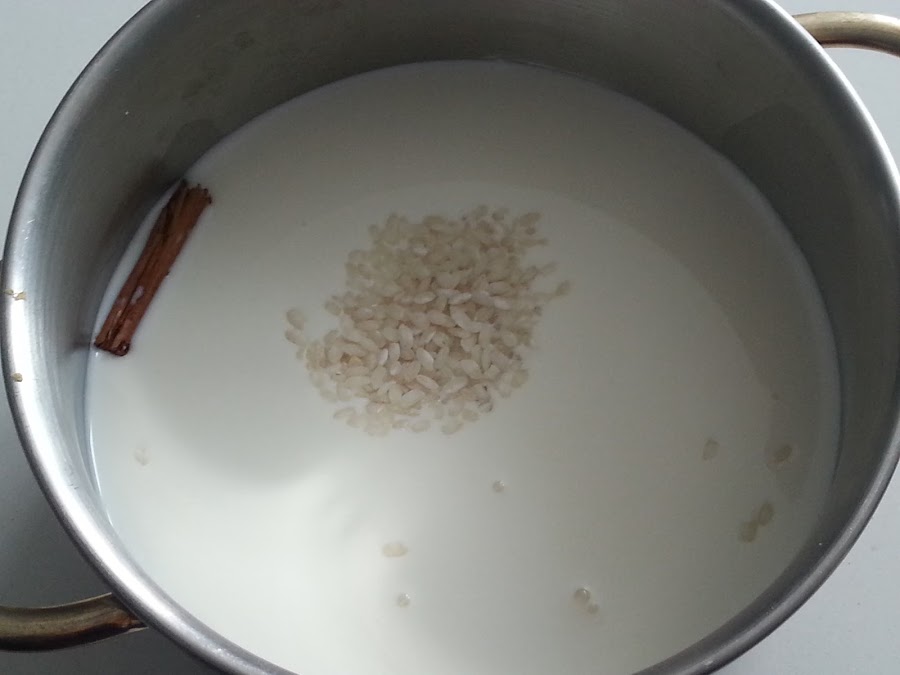 1. - En un cazo ponemos la leche, el arroz, el azúcar, la rama de canela y la nata (crema de leche).