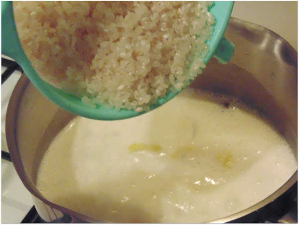 Enjuagamos previamente el arroz tipo redondo y añadimos al cazo.