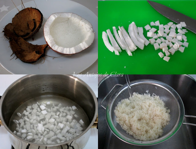 Despegamos el coco de la concha dura y quitamos la cáscara fina que lo recubre. Cortamos la pulpa en tiras finas y sacamos daditos de 1 cm de largo aprox. Ponemos a calentar en una cacerola de fondo grueso los 900 ml de agua con el coco picado y dejamos hervir por 10 minutos a fuego medio sin tapar. ¡Ojo!, no dejen cocer el coco por más tiempo, necesitamos que haya suficiente agua para cocinar el arroz.