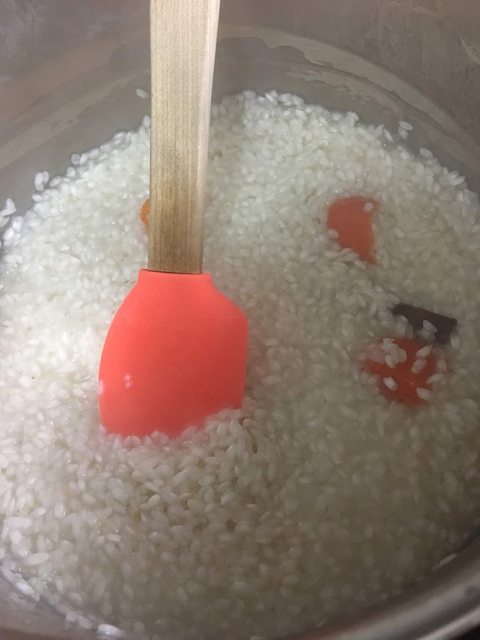 Se pone en una cazuela el arroz con la cáscara de naranja o limón y la rama de canela. se añade una pizca de sal y se cubre con agua. Se lleva a ebullición.