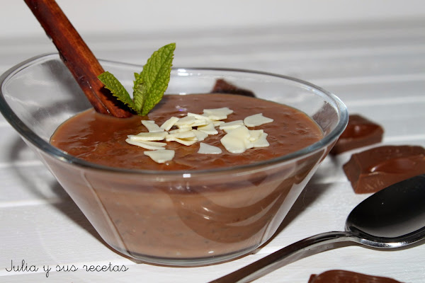 Lo servimos en cuencos y dejamos enfriar. Lo decoramos con virutas de chocolate blanco.