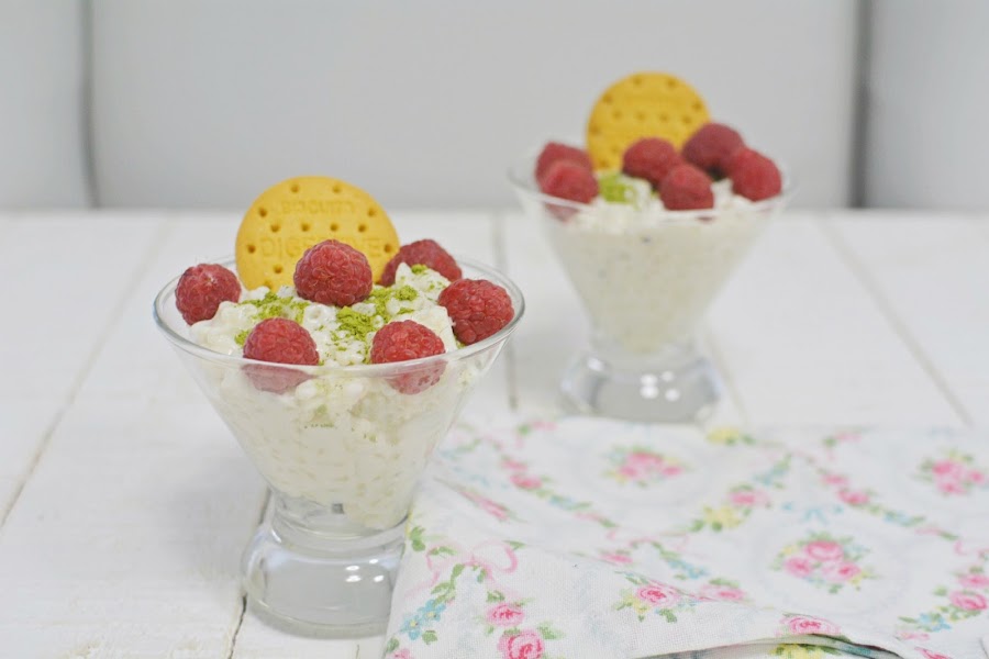 A la hora de servir espolvoreamos una pizca de té verde matcha. Añadimos unas frambuesas y acompañamos de una galleta Gullón.