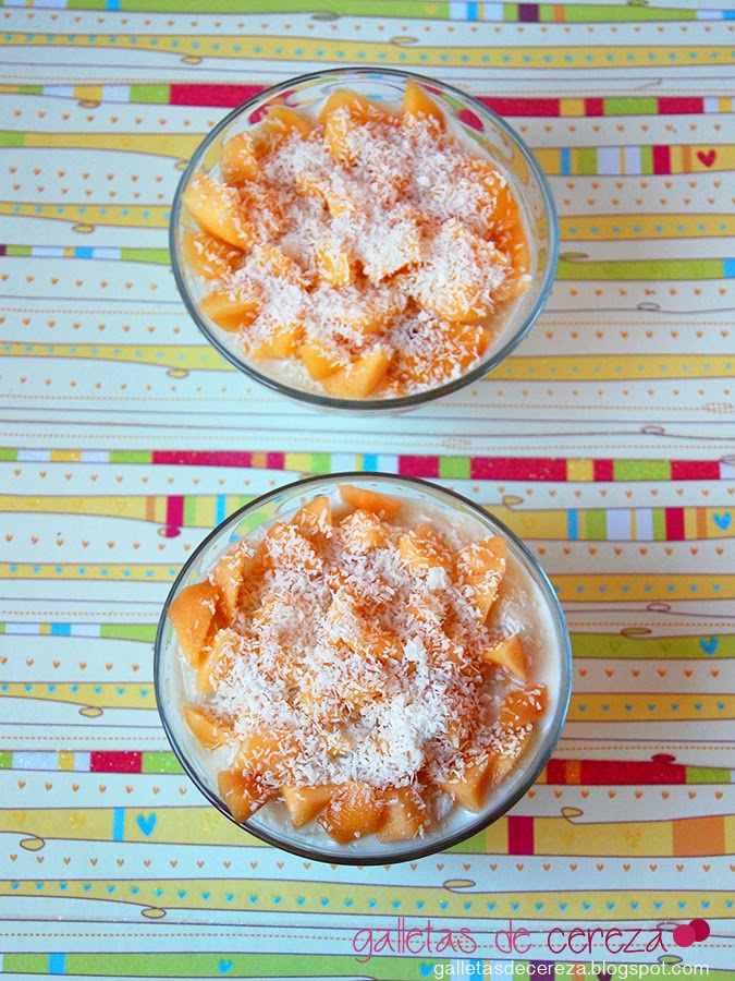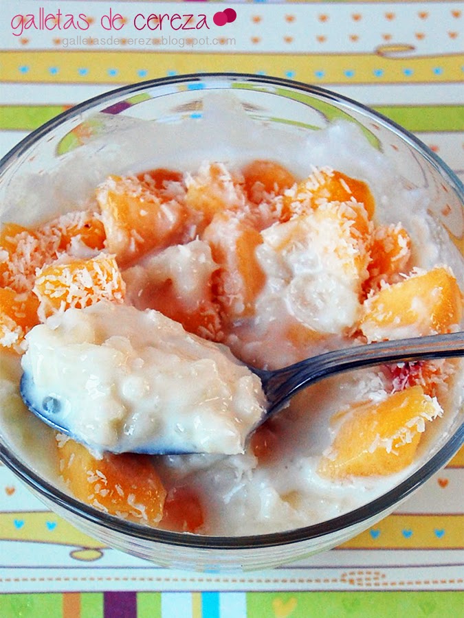 A la hora de servir disponemos primero unos trocitos de melocotón en el fondo del cuenco, espolvoreamos con coco rallado, añadimos el arroz con leche, y volvemos a poner melocotón y coco rallado.