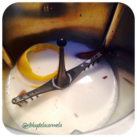 50 minutos a 90 grados en la thermomix mezclándose a velocidad cuchara y con la mariposa, la leche, la cáscara de limón y la canela (si es en olla poner a fuego alto e ir moviendo con pala de madera)