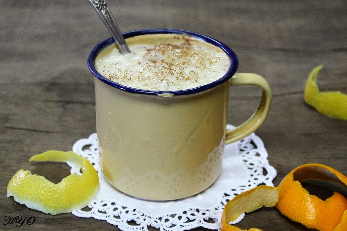 1. Llevamos una cacerola al fuego con la leche, el azúcar, las pieles de los cítricos (evitando en lo posible la parte blanca), la rama de canela y la vainilla cortada a lo largo.