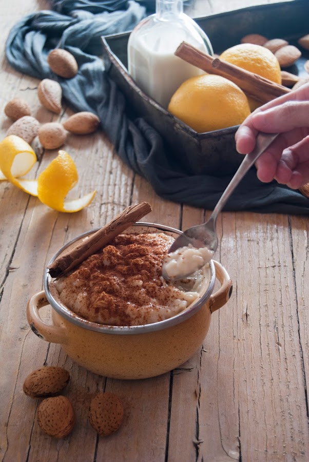 Puedes repartir el arroz en vasitos, copas o donde prefieras y espolvorearlos con la canela. Yo he elegido una cazuelita que era de mi abuela. Ella sabe cuánto me gustan sus cacharritos de cocina antiguos para mis fotos y me ha regalado algunas cosas :-) :-)
