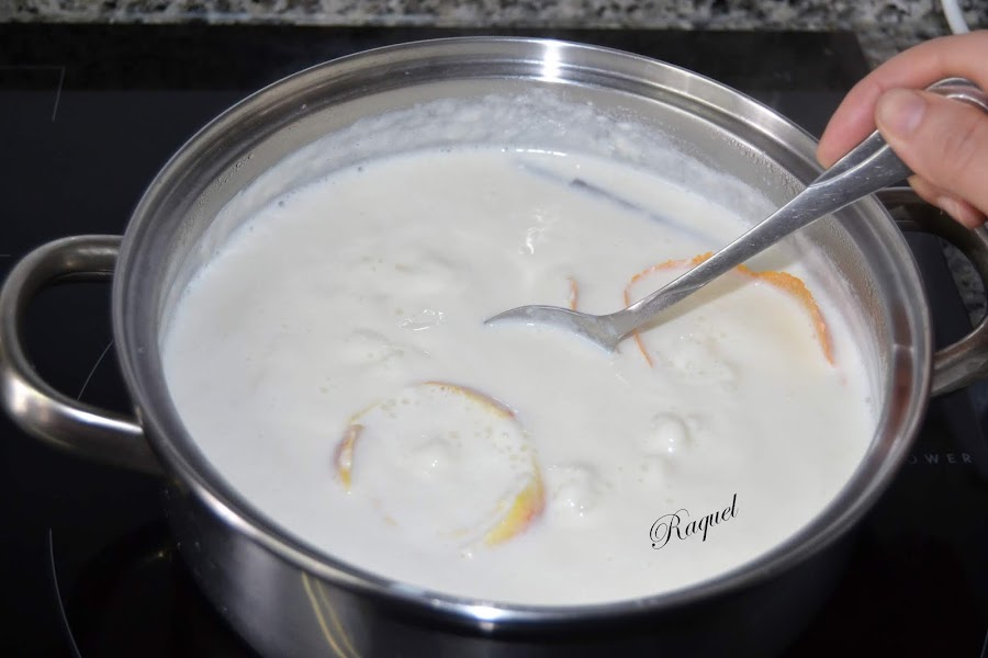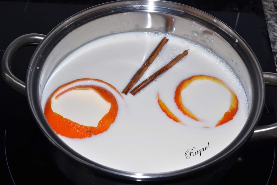 Ponemos la leche en un cazo a hervir, junto la piel de naranja, la del limón y la canela.