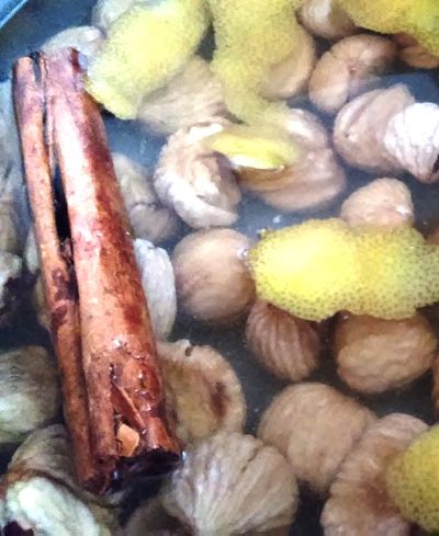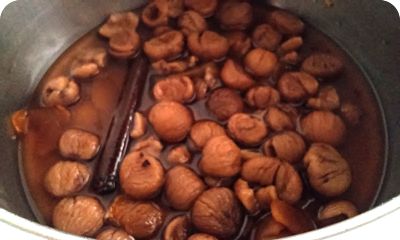 Cuece a fuego medio-bajo hasta que las castañas estén tiernas. Cuida de que no se queden sin agua y añade un poco más si hace falta. las castañas irán tomando color y se irá haciendo el almíbar.