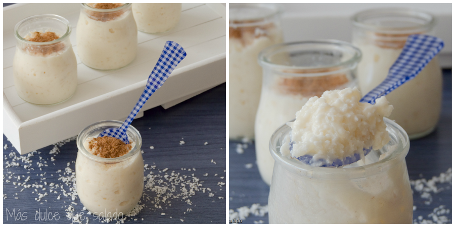 Sale un arroz con leche bastante cremoso, en parte por el coco. Y sabe mucho, mucho a coco. Sí os gusta que el arroz con leche se quede más suelto, le podéis añadir un poco más de leche. Y si solo queréis que tenga un toque de coco, yo le pondría la mitad de lo que indica la receta.