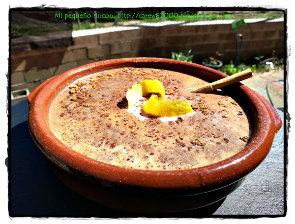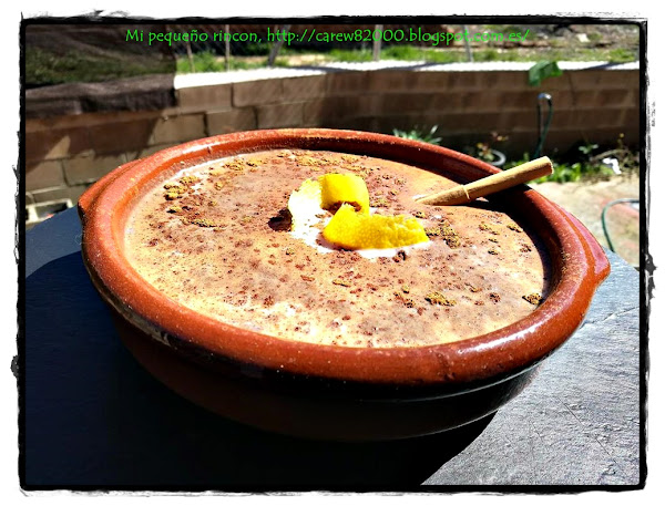 Pasadas varias horas servimos, espolvoreando un poco de canela, yo lo he presentado en un plato de porcelana de la fábrica Porvasal en Chiva (Valencia).