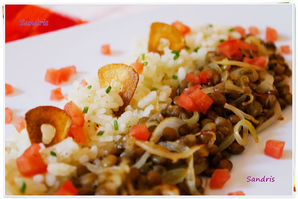LaurelLas lentejas las herví con un poco de laurel, unos granos de pimienta negra y ajo y ya en la sartén sofreí un poco de cebolla (sin mucho aceite, solo unas gotitas) y le puse un poco de pimienta negra. El arroz me gusta sofreirlo con un poco de ajo y pimienta negra. Y solo queda cortar un poco de cebollino y tomate natural en brunoise (cuadraditos muy pequeños) y listo!!!